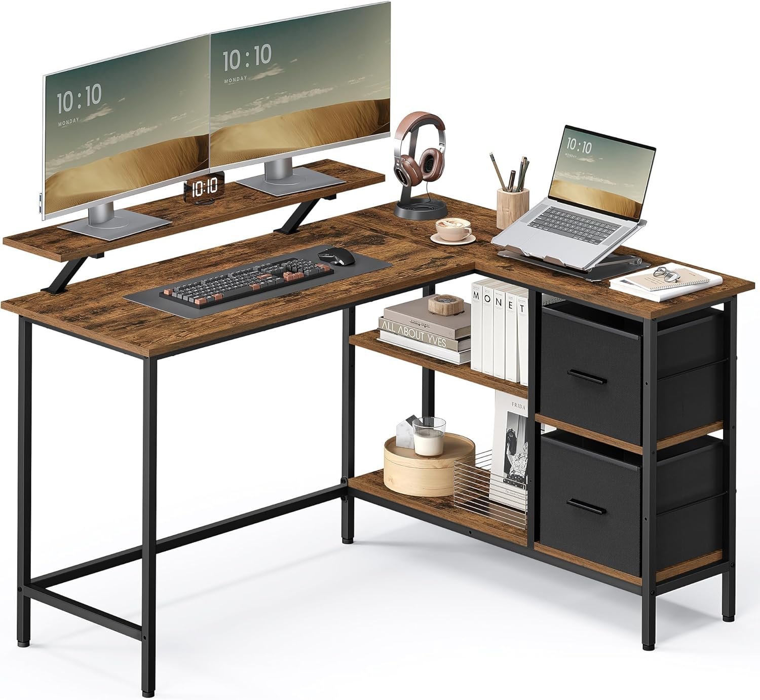 Specification: VASAGLE Birou in forma de L, suport monitor, 2 rafturi si 2 sertare, 105x135x76 cm, maro rustic