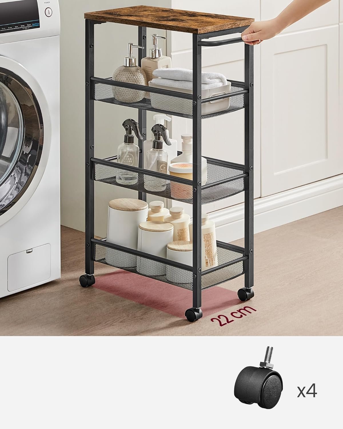 Specification: VASAGLE Carucior de bucatarie ingust cu roti, 4 niveluri, cadru metalic, 22x46x77 cm, maro rustic