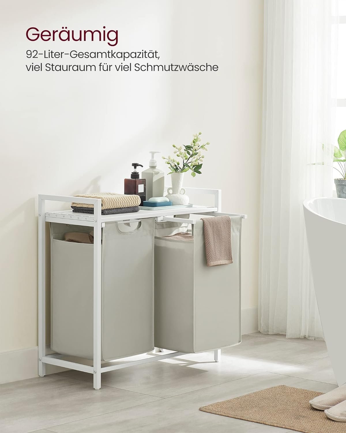 VASAGLE Cos de rufe, 2 compartimente, saci de rufe detasabili, raft, cadru metalic, 2x46L, 73x33x72 cm, alb