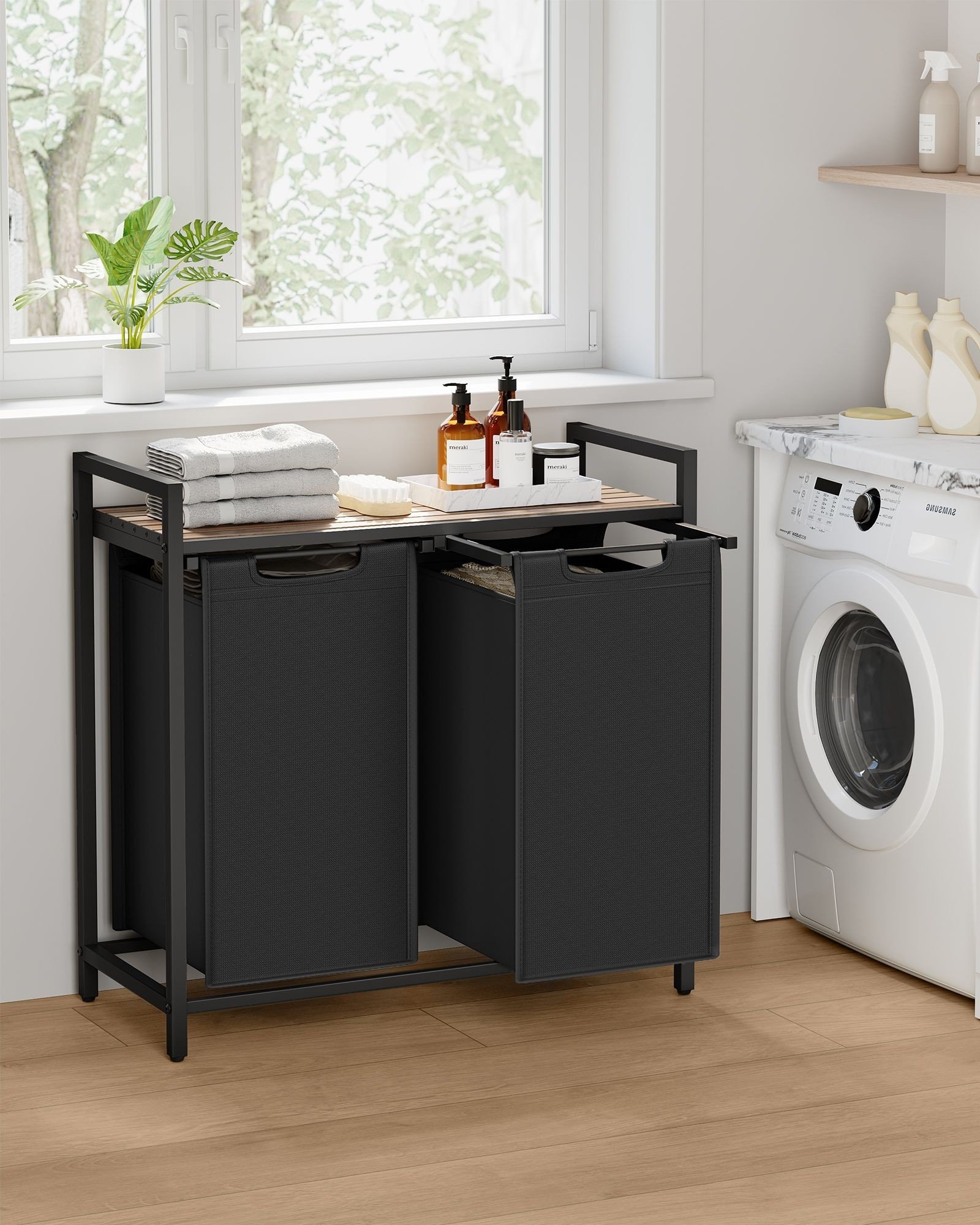 Specification: VASAGLE Cos de rufe, 2 compartimente, saci de rufe detasabili, raft, cadru metalic, 2x46L, 73x33x72 cm, maro si negru
