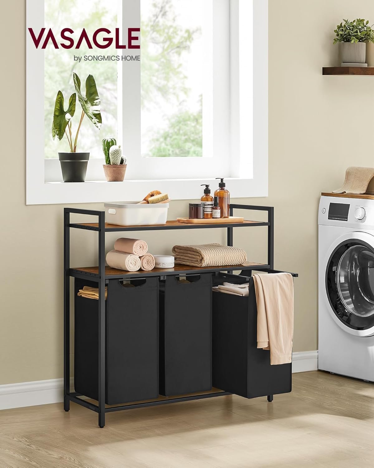 VASAGLE Cos de rufe cu 3 saci detasabili, 3×40 litri, 2 rafturi, structura metalica, stil industrial, 92x33x92 cm, maro rustic