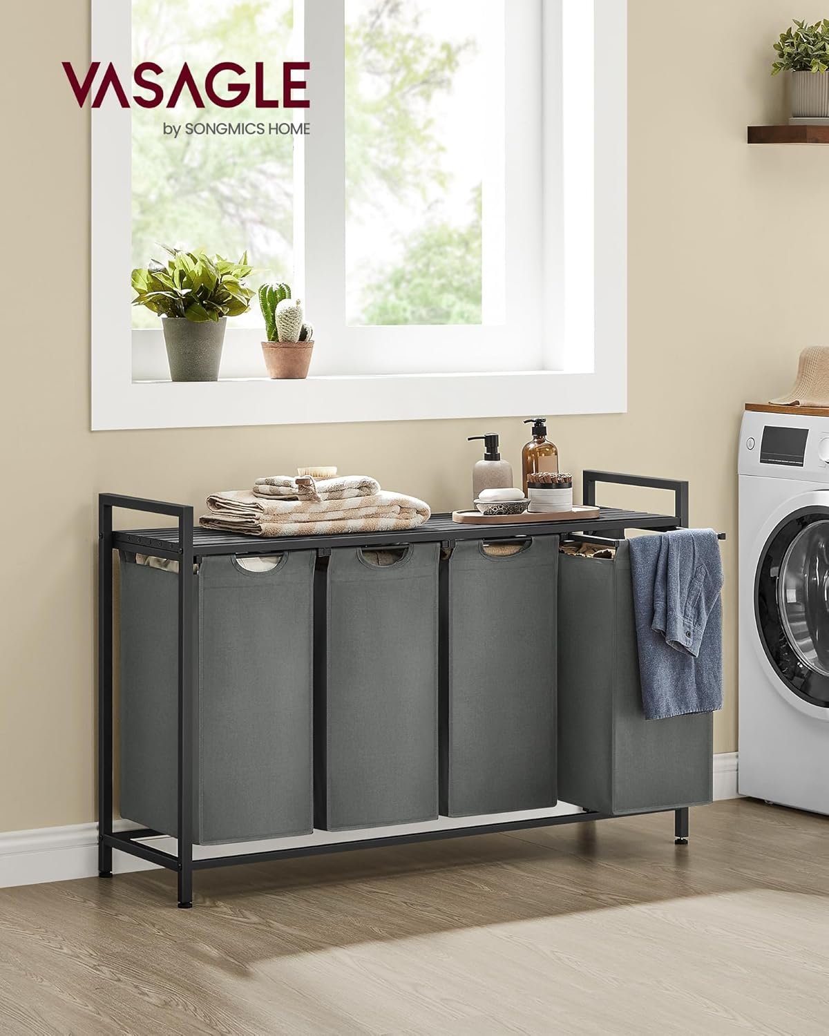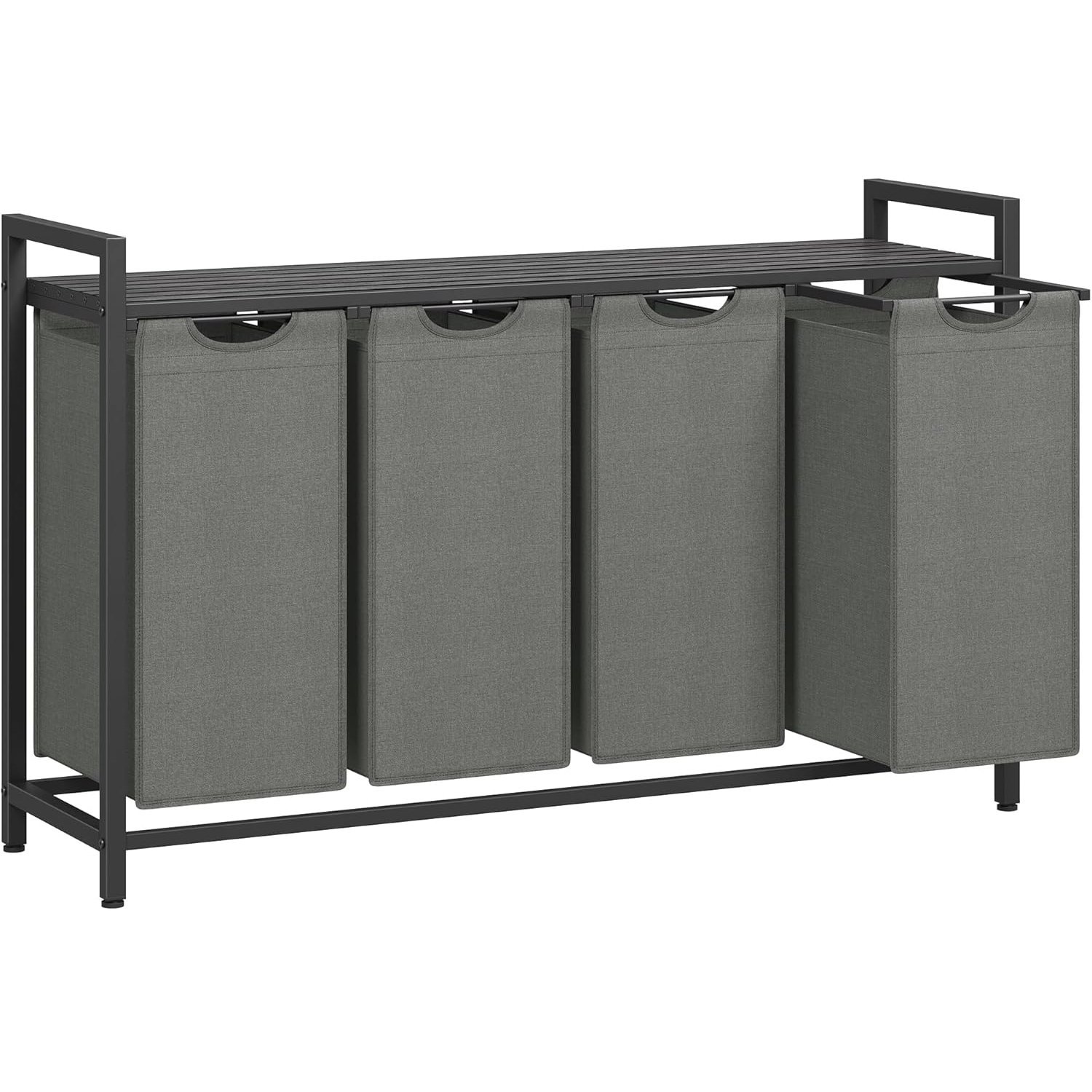 VASAGLE Cos rufe 4x40L, saci detasabili, raft superior si cadru metalic, 116x33x72 cm, negru si gri