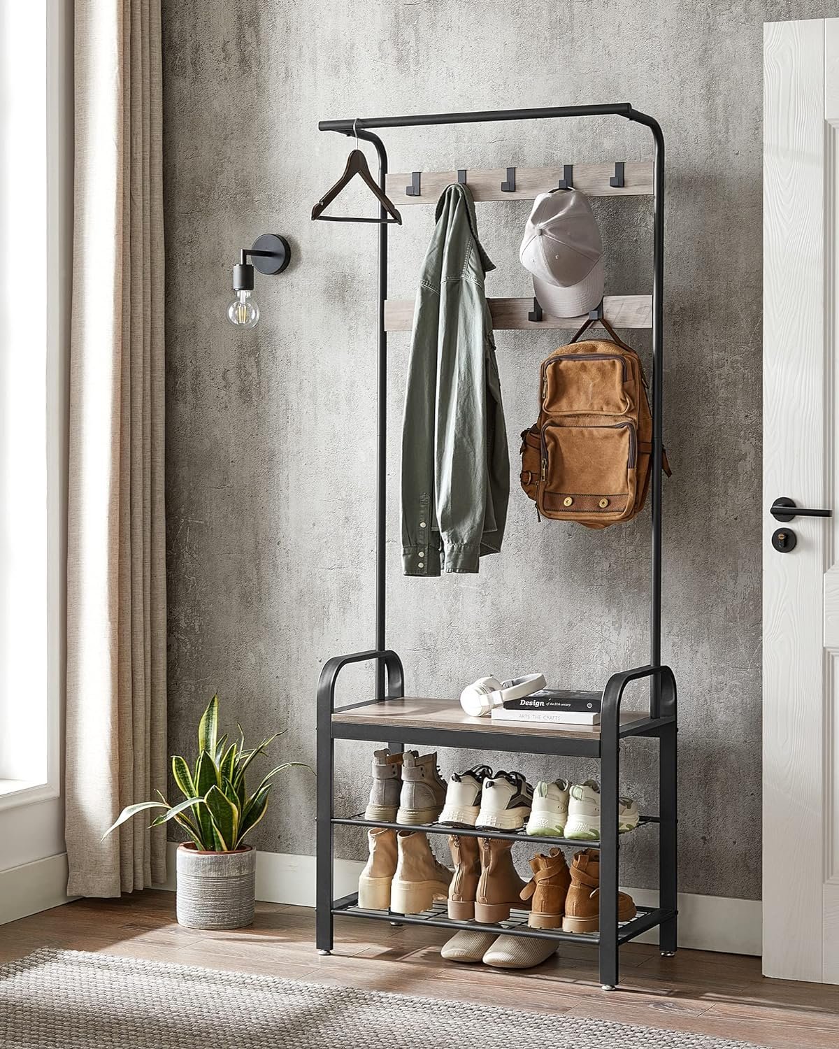 VASAGLE Cuier pentru haine cu banca de depozitare pantofi, cu 9 carlige si sina pentru haine, 34x72x183 cm, gri si negru