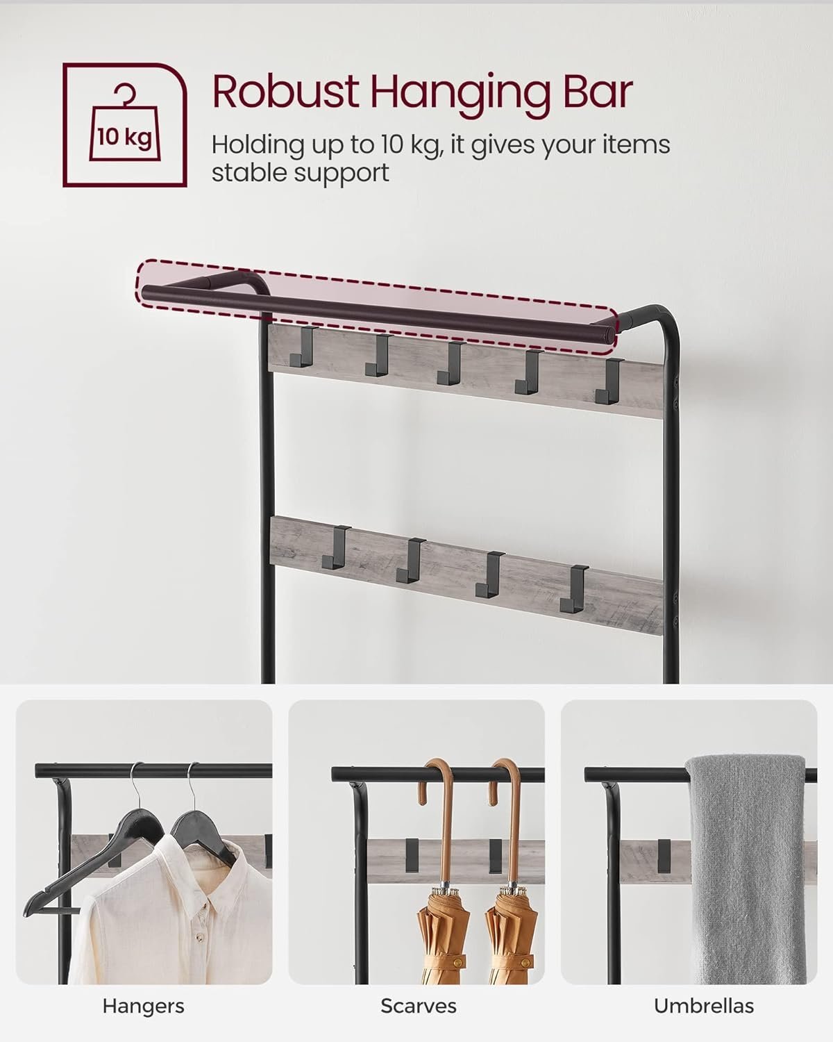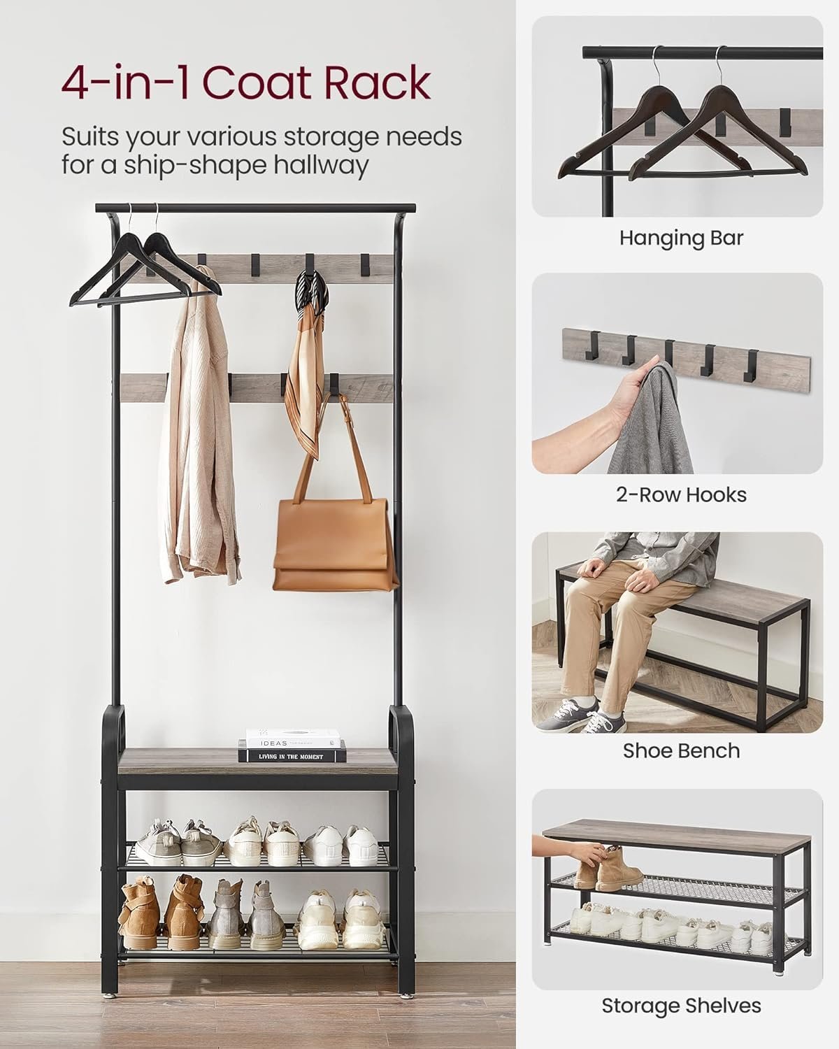 Specification: VASAGLE Cuier pentru haine cu banca de depozitare pantofi, cu 9 carlige si sina pentru haine, 34x72x183 cm, gri si negru