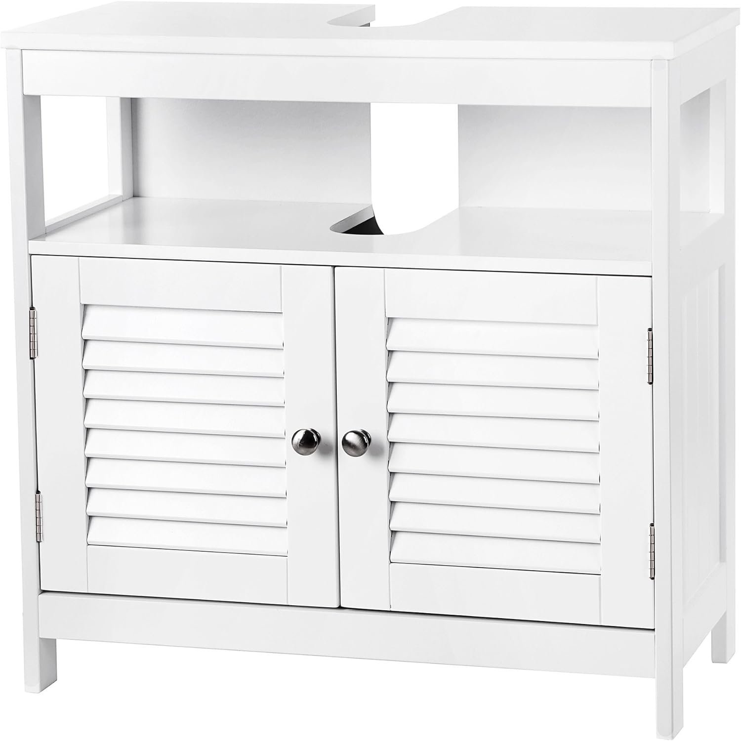 Marca: VASAGLE Culoare: alb Dimensiuni produs: 30D x 60L x 60H cm Caracteristica speciala interior Material pe baza de lemn Despre acest articol Ofera mult spatiu de depozitare. Material rezistent la umezeala, de asemenea usor de curatat – Dulapul de perete este fabricat din carton MDF (clasa E1), suprafata tratata cu lac, rezistent la umezeala si mucegai, de asemenea usor de curatat.Face asamblarea usoara – instructiunile grafice detaliate va ghideaza pas cu pas in realizarea dulapului de chiuveta, piesele individuale sunt atribuite cu litere, astfel incat sa nu existe confuzii. Partea de sus: 1 compartiment deschis (dimensiuni interioare: 56 x 19 x 28 cm (L x ih x ih) pentru depozitarea usor accesibila a ustensilelor utilizate frecvent; Partea inferioara: 1 compartiment opac in spatele usilor (dimensiuni interioare: 56 x 30,5 x 28 cm L x H x P), prosoapele de mana, hartia igienica si alte accesoriile de baie sunt protejate de praf, apa si de privirile nedorite.2x usi cu lamele care pot fi deschise prin rotire la 180° – usile elegante cu lamele cu manere metalice transmit un stil confortabil de casa de tara, albul atemporal se potriveste cu orice stil de decor; in acelasi timp, acestea asigura o buna ventilatie si previn astfel riscul aparitiei mucegaiului si a mirosurilor de mucegai. Dimensiuni – dimensiunile taieturii sifonate: 20 x 8 cm, dimensiunile dulapului de baza: 60 x 60 x 60 x 30 cm (L x H x P), inainte de cumparare, va rugam sa masurati dimensiunea sifonului chiuvetei dvs. si spatiul disponibil sub chiuveta si sa determinati daca acest dulap se potriveste.
