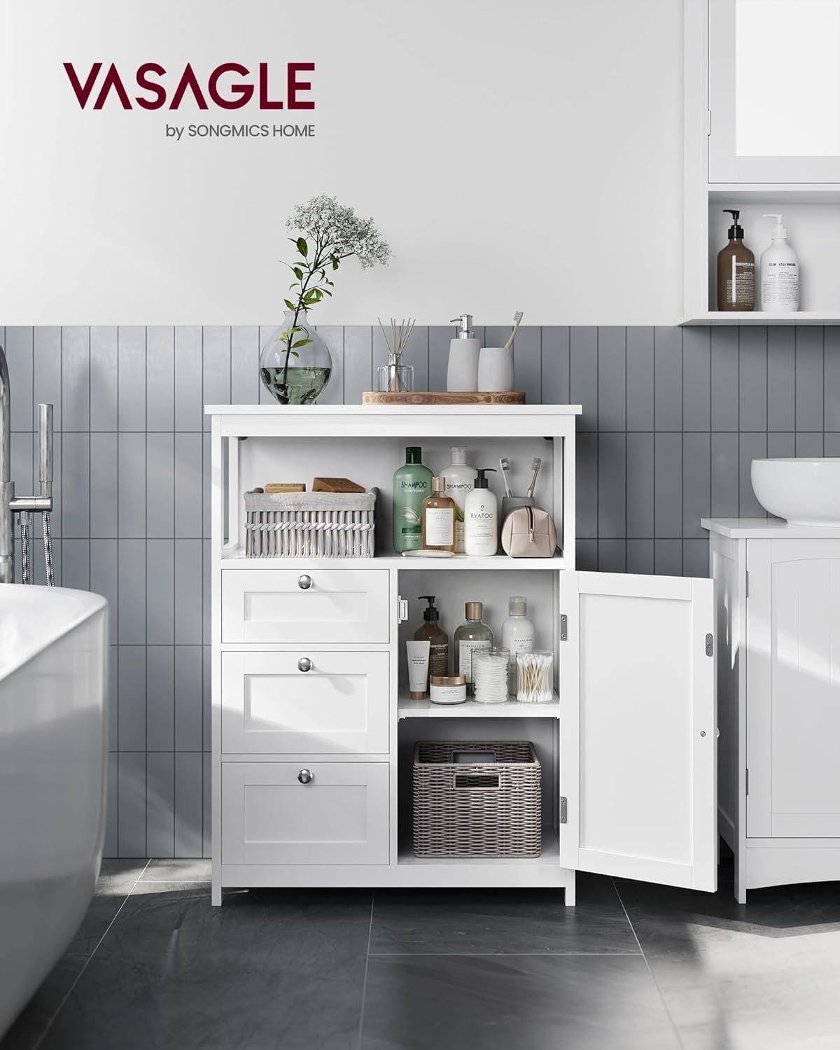 VASAGLE Dulap de baie cu 3 sertare si dulap, raft reglabil, MDF, 60x30x80 cm, alb