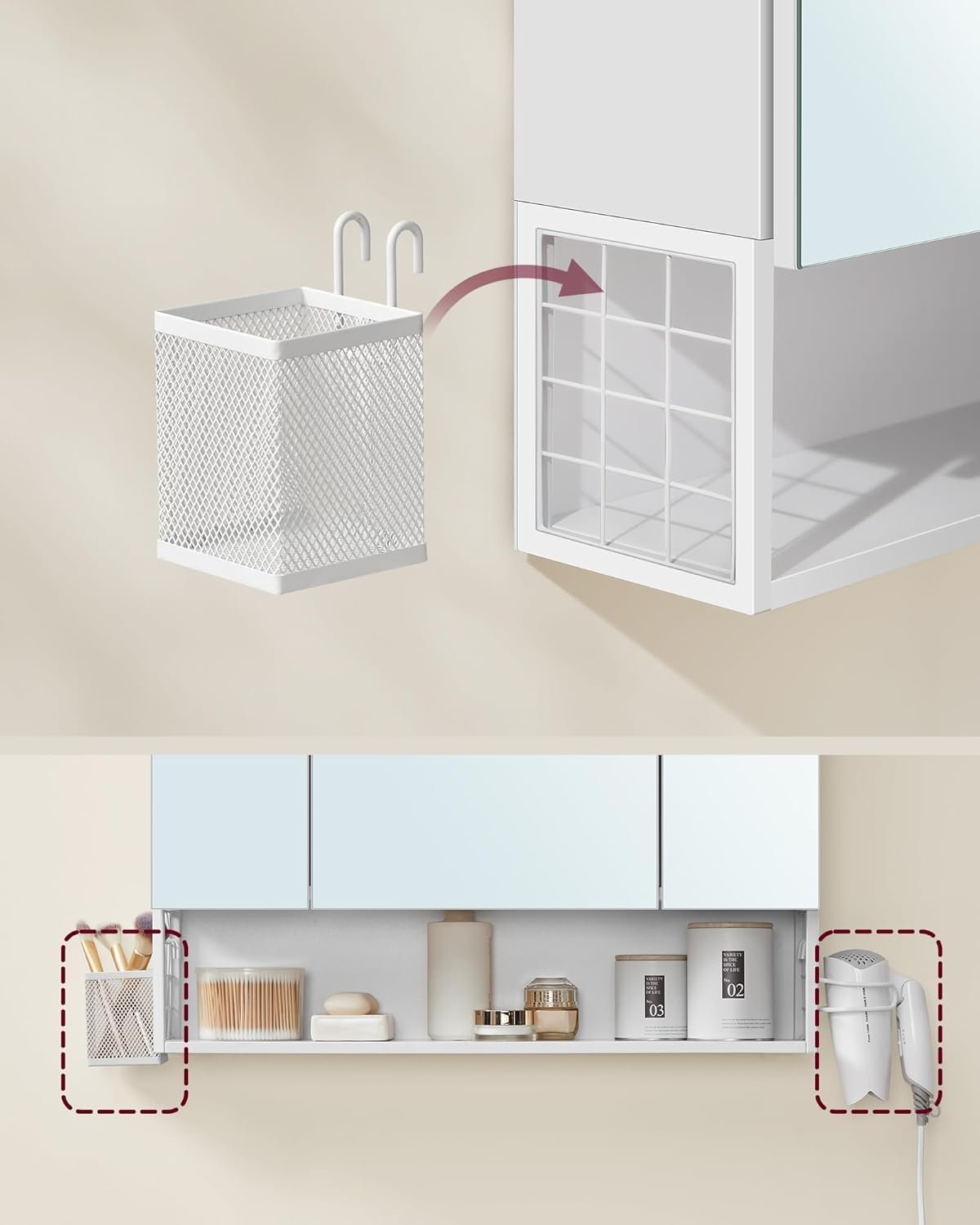 Specificatii tehnice Brand: VASAGLE Material: PAL, MDF, metal, sticla Dimensiuni: 16.5x70x75 cm Iluminare: LED integrat Prize: 2 prize AC + 2 porturi USB Accesorii: Suport uscator par, cos suspendat Culoare: alb Scurta descriere Dulapul VASAGLE cu oglinda si iluminare LED este o solutie moderna si practica pentru organizarea baii. Dotat cu prize si porturi USB, permite utilizarea si incarcarea aparatelor electrice direct in dulap. Designul inteligent include spatii de depozitare variate si accesorii utile, oferind confort si functionalitate zilnica. Caracteristici principale Oglinda cu iluminare LED pentru rutina zilnica Compartiment deschis pentru acces rapid Dulap cu usi pentru depozitare discreta Suport pentru uscator de par inclus Cos suspendat pentru organizare eficienta Design modern si practic pentru baie Materiale rezistente si durabile Montaj pe perete pentru economie de spatiu