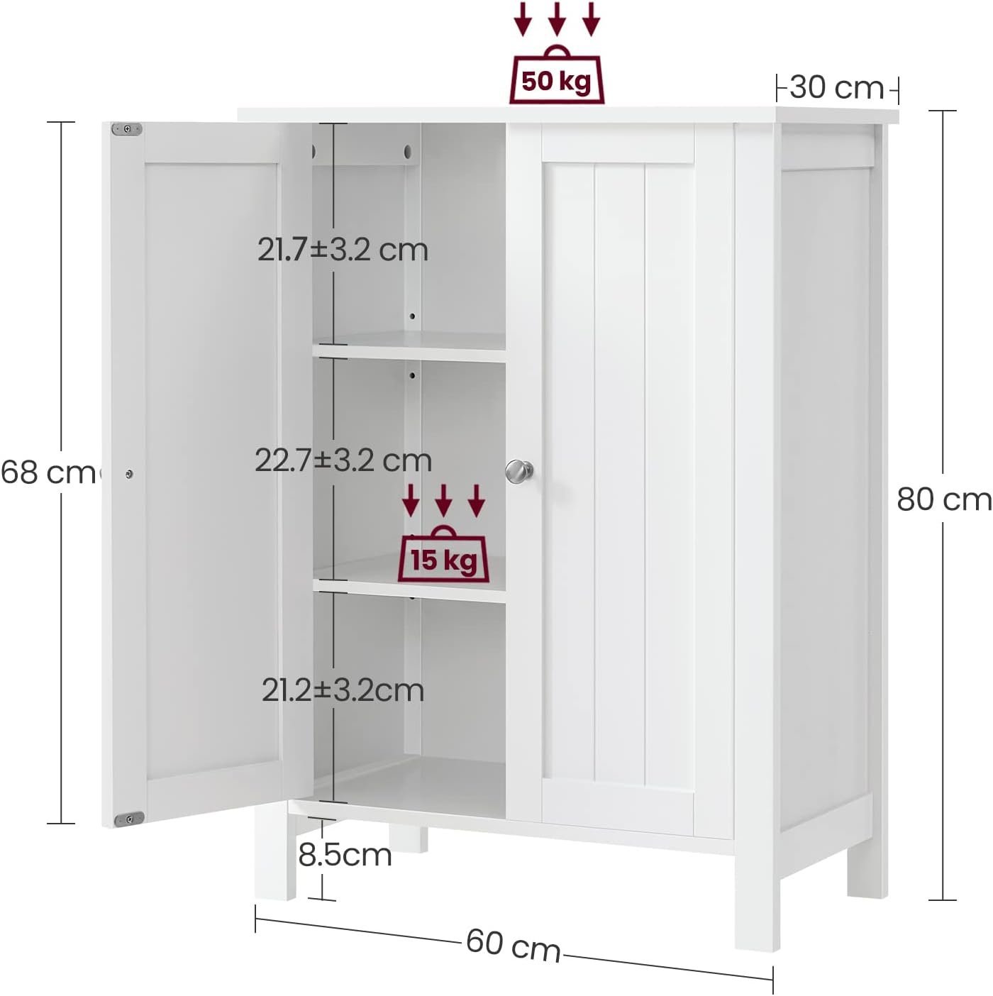 Specification: VASAGLE Dulap de depozitare de podea pentru baie, cu 2 rafturi reglabile, 30x60x80cm, alb