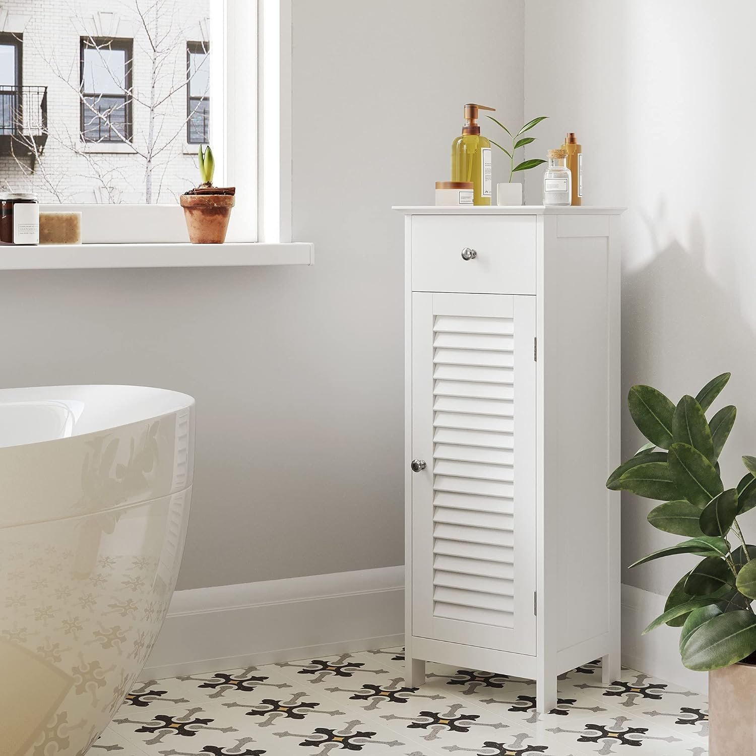 Specification: VASAGLE Dulap de depozitare de podea pentru baie, din lemn cu sertar, usa cu lamele, 32x30x87cm, alb