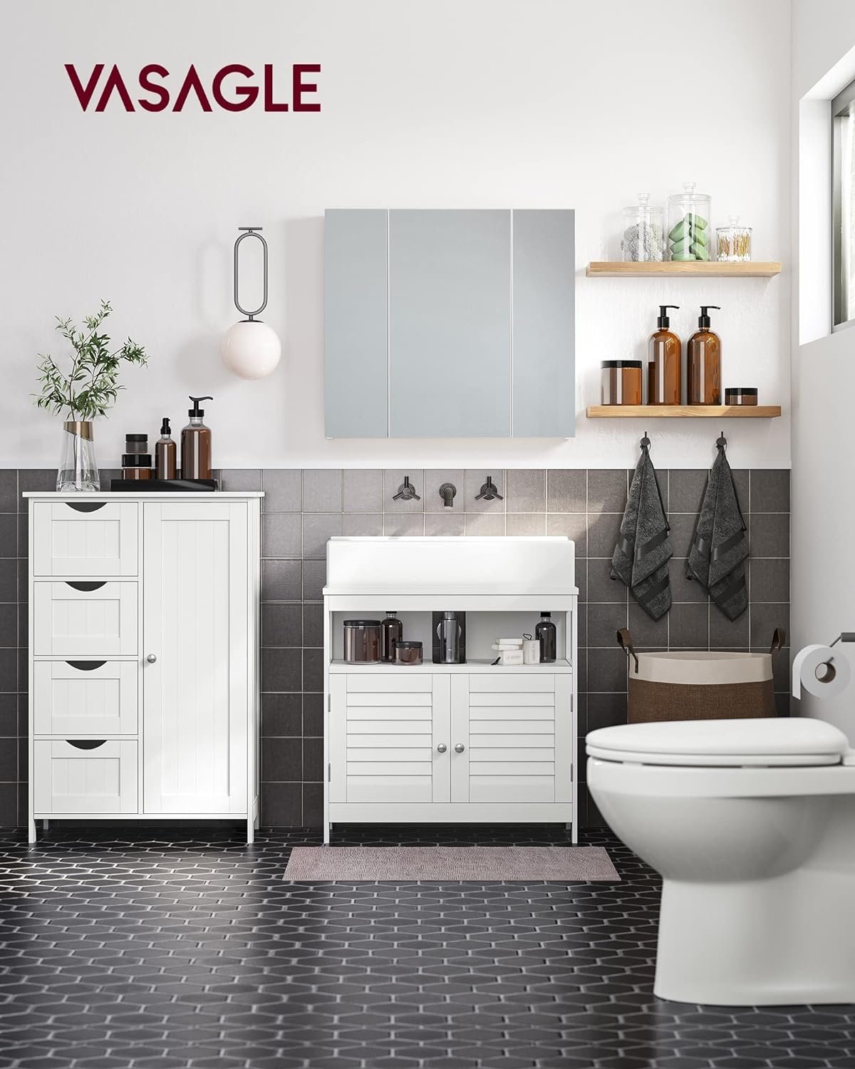 Marca: VASAGLE Culoare: Alb Dimensiuni produs: 30D x 55W x 82H centimetri Despre acest articol Depozitare categorizata: Articolele des folosite pe blat, cele 4 sertare si articolele de diferite dimensiuni merg pe raftul reglabil (disponibile in 3 inaltimi) din spatele usii – acest dulap de baie va va oferi o baie ordonata.Robust si sigur: Fabricat din MDF robust, acest dulap de depozitare pentru baie este robust si stabil; trusa anti-rasturnare de pe spatele acestui dulap de depozitare sporeste stabilitatea si siguranta generala.Compact, dar spatios: Cu o forma compacta, aceasta unitate de depozitare pentru baie ocupa doar 30 x 55 cm spatiu pe podea, oferind in acelasi timp mult spatiu de depozitare. Cu aceasta unitate, puteti folosi pe deplin spatiul ingust de baie.Adaugare frumoasa la orice camera: Culoarea alba eleganta si un design simplu fac o unitate de depozitare ingrijita si eleganta, care se potriveste frumos cu decorul casei tale, fie ca este vorba de baie, sufragerie sau hol.Nu va faceti griji pentru asamblare! Piesele numerotate si instructiunile usor de urmat fac din acest dulap de baie de sine statator asamblat usor.
