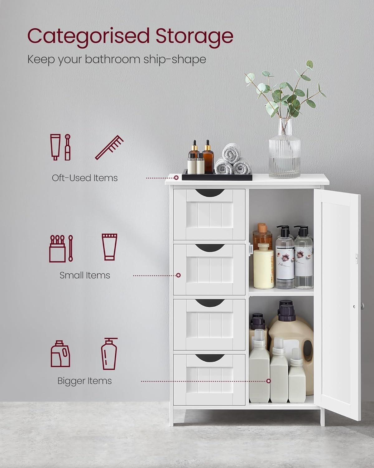 Specification: VASAGLE Dulap de depozitare pe podea pentru baie, din lemn, cu 4 sertare, 1 usa, rafturi reglabile, 30x55x82cm, alb