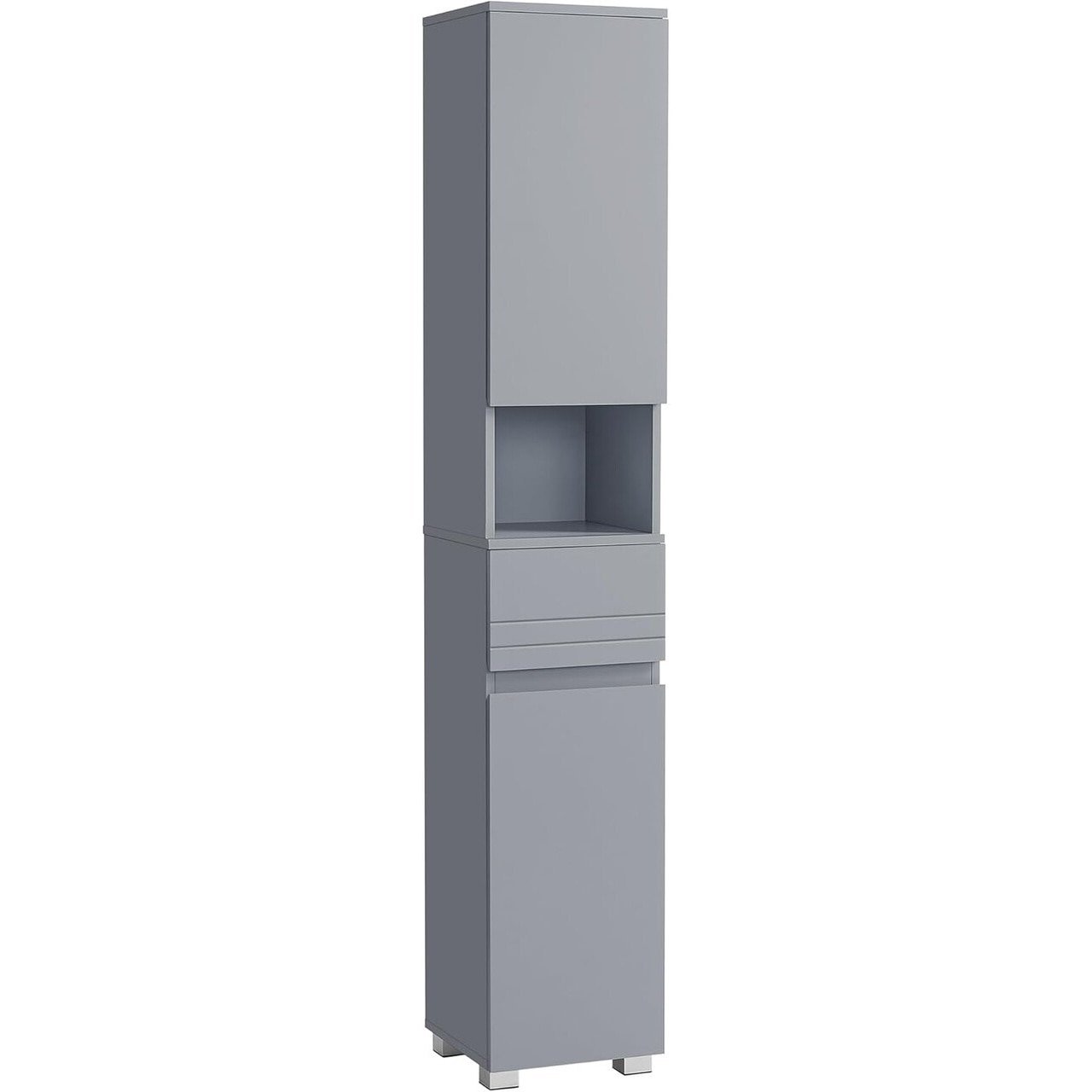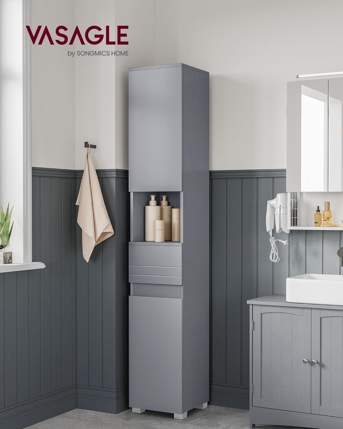 VASAGLE Dulap inalt 30x30x170 cm, cu sertar, rafturi reglabile si usi reversibile, MDF, gri