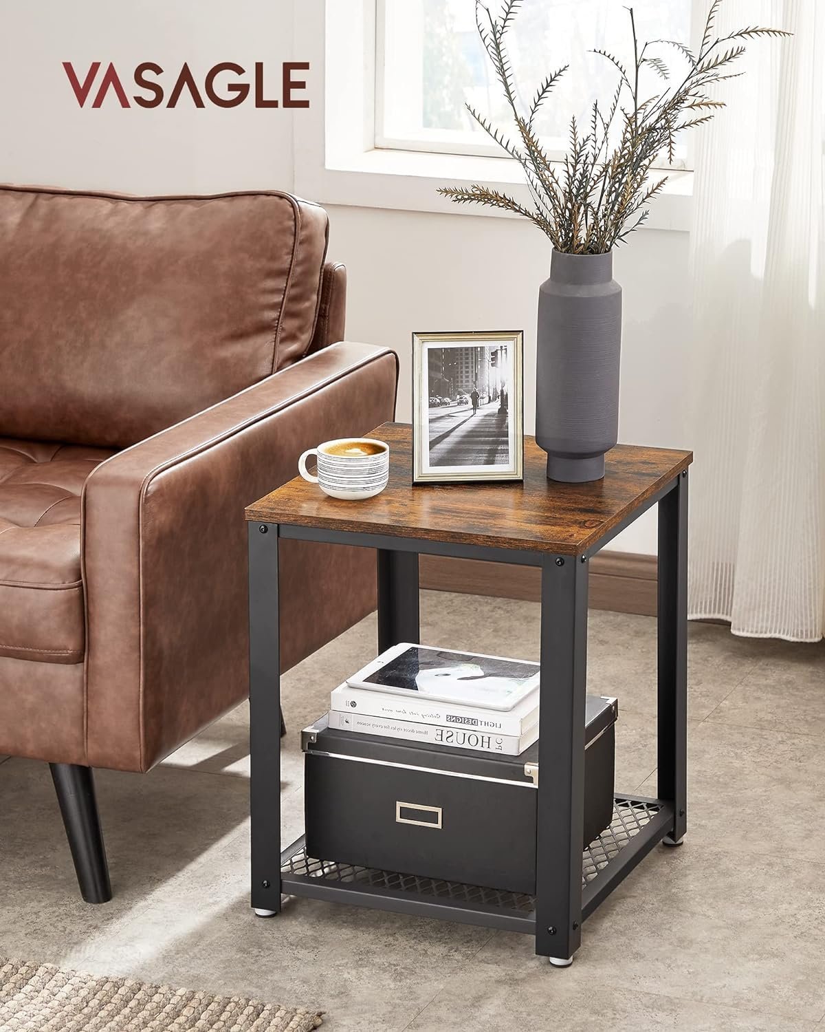 Specification: VASAGLE Masa de cafea laterala, tip noptiera, cu cadru metalic, 45x45x55cm, maro rustic si negru