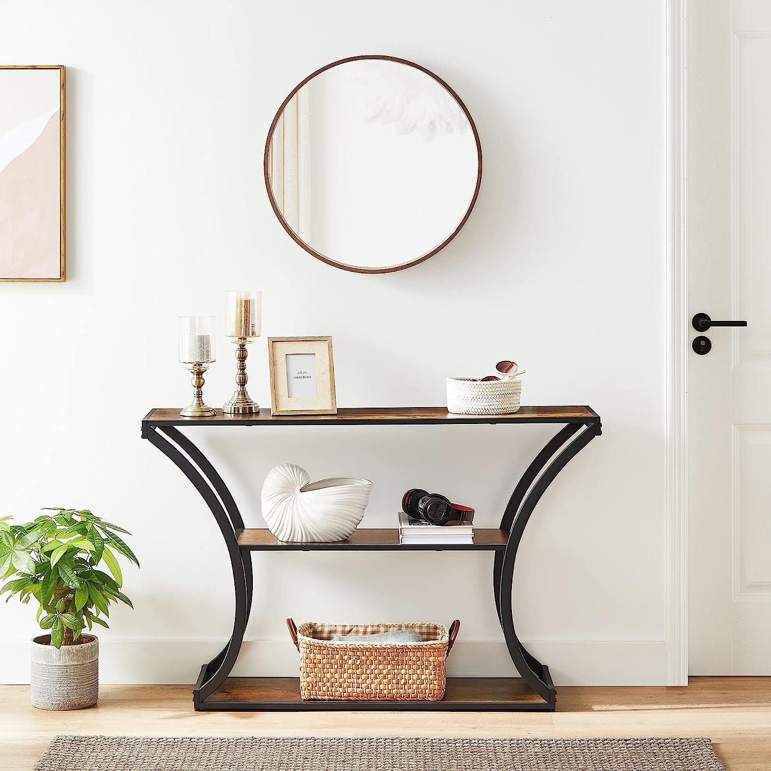 Specification: VASAGLE Masa de intrare cu picioare curbate, cadru otel si 3 polite lemn, stil industrial, 120x30x80cm, maro rustic si negru