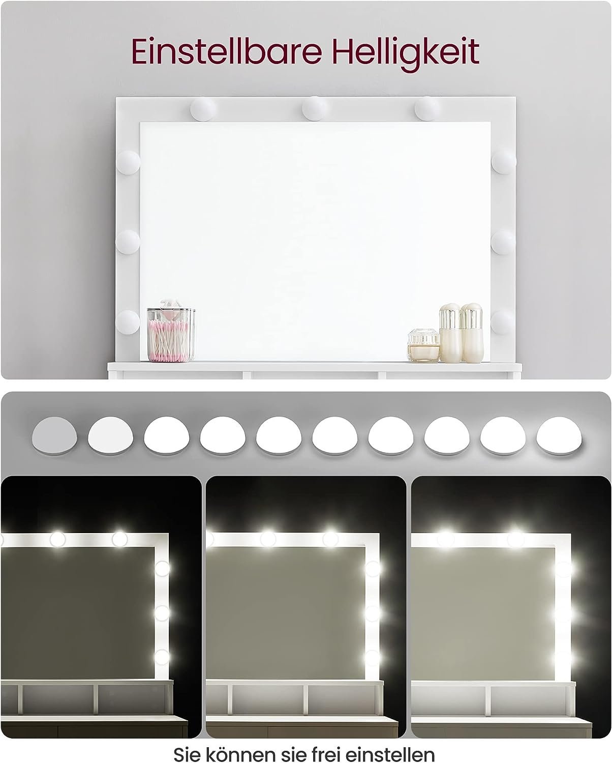 Culoare: Alb Dimensiuni: 80 x 40 x 140 cm Dimensiunile produsului: 40D x 80L x 140H cm Marca: VASAGLE Material cadru: Lemn prelucrat Despre acest articol Perfect stilizat: Cele 9 becuri reglabile ale acestei masute de toaleta care inconjoara oglinda pot fi atenuate prin apasarea intrerupatorului si iti lumineaza zona de infrumusetare – astfel incat sa poti evoca un machiaj perfect.O mai buna organizare a produselor dvs. cosmetice: Cele 2 sertare mari si cele 3 compartimente deschise ale masutei de toaleta ofera suficient spatiu pentru machiajul dvs. si faciliteaza organizarea cosmeticelor dvs.Se potriveste perfect: Datorita liniilor curate, a culorii albe si a aspectului modern, aceasta masa de toaleta se potriveste perfect in dormitorul dvs. Intr-un colt sau langa pat? Decizia va apartine.Asamblare usoara: Va punem la dispozitie instructiuni clare si piese etichetate – aceasta masuta de toaleta va fi in curand in picioare in camera dvs.Suprafata de masa organizata: Deranjata de pudra si fardurile de ochi imprastiate?nu va faceti griji. Acoperirea melaminica a suprafetei este usor de curatat.
