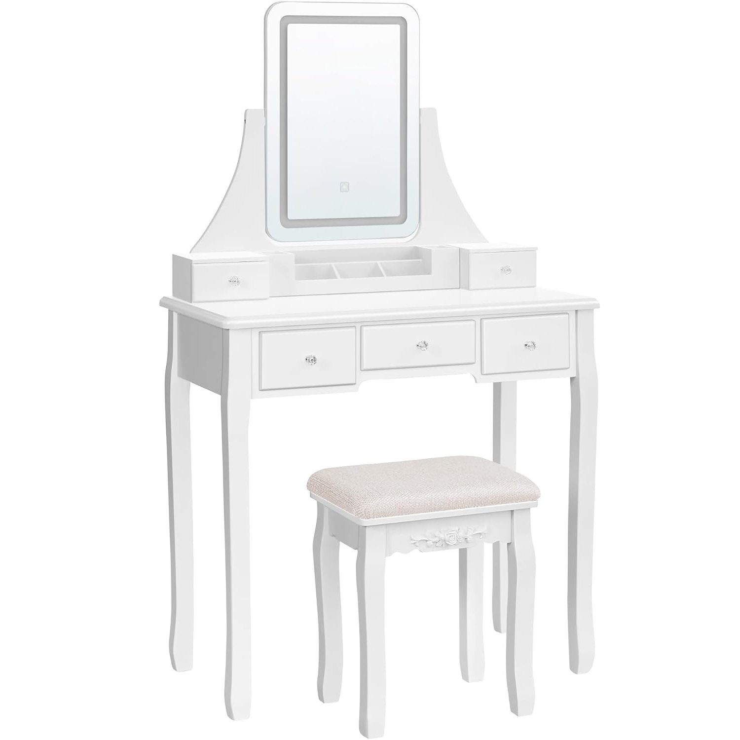 VASAGLE Masa de toaleta cu taburet, oglinda rotativa 360°, iluminare LED reglabila, 80x40x138 cm, alb