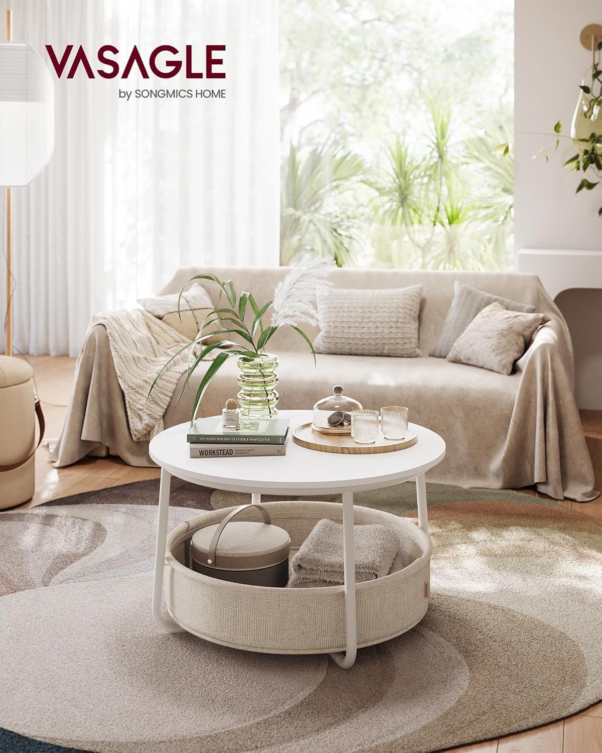 VASAGLE Masuta de cafea rotunda cu cos de stofa, stil modern, 45x75cm, alb cu bej