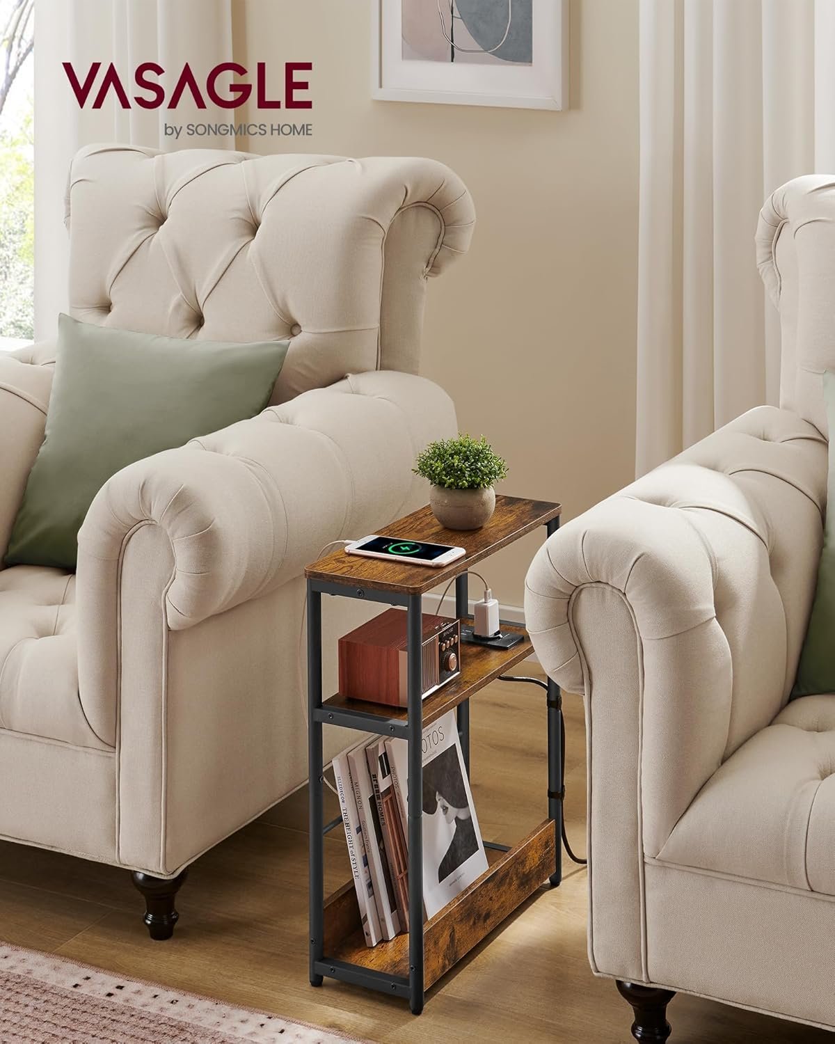 Specification: VASAGLE Masuta ingusta cu priza si porturi de incarcare USB, 3 rafturi, 45x18x58 cm, maro rustic