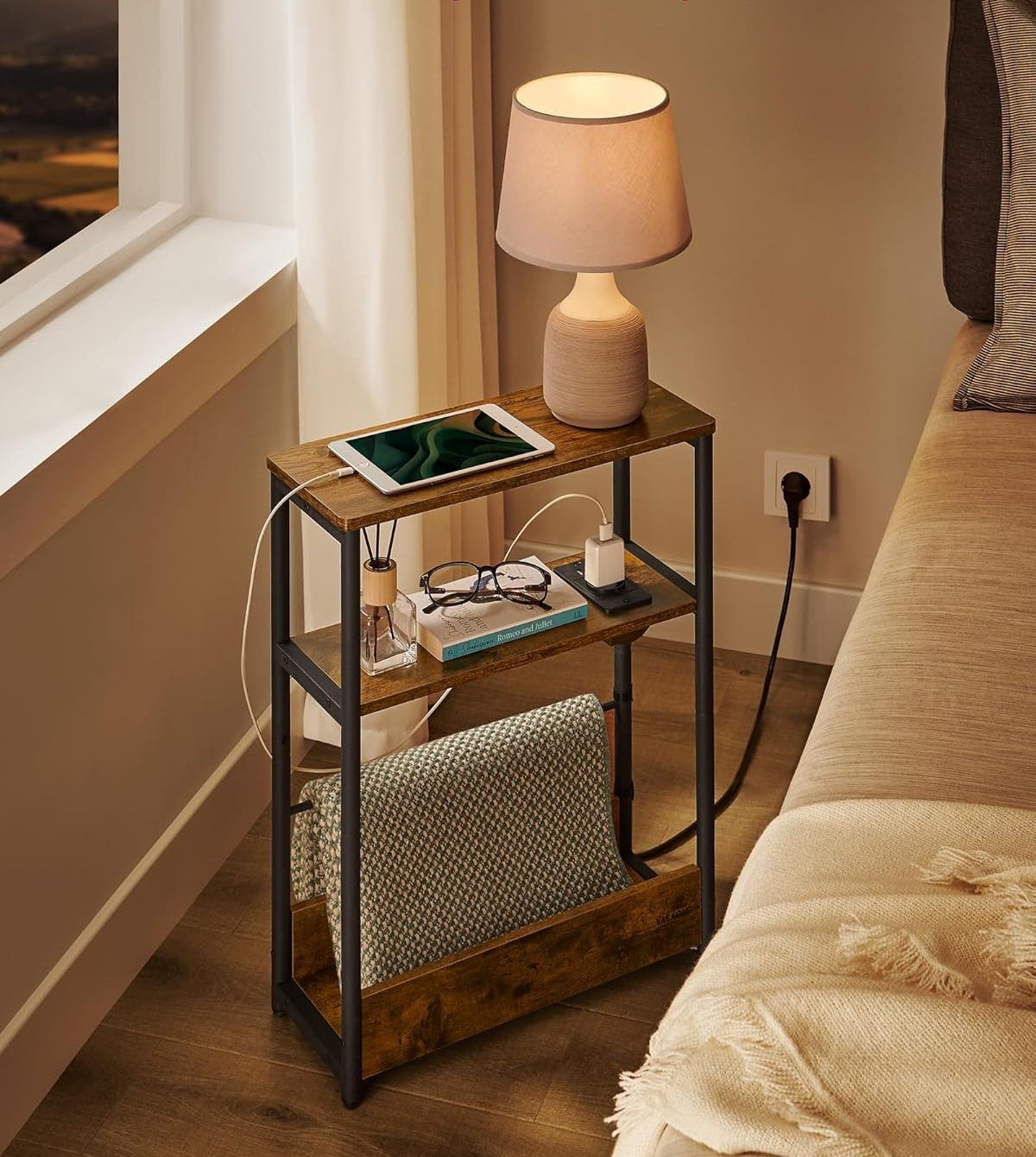 VASAGLE Masuta ingusta cu priza si porturi de incarcare USB, 3 rafturi, 45x18x58 cm, maro rustic