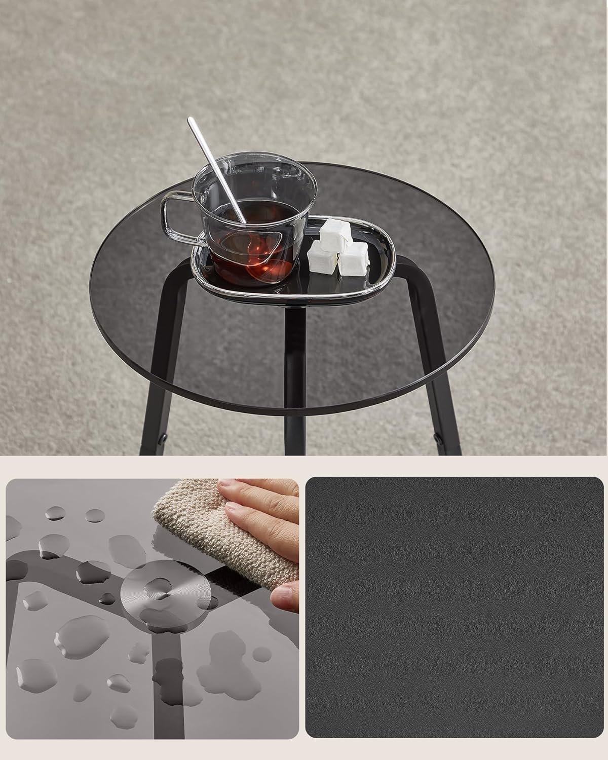 Be the first to review “VASAGLE Masuta rotunda tip noptiera, blat din sticla si raft inferior din PAL, cadru metalic, 30x30x55 cm, negru”