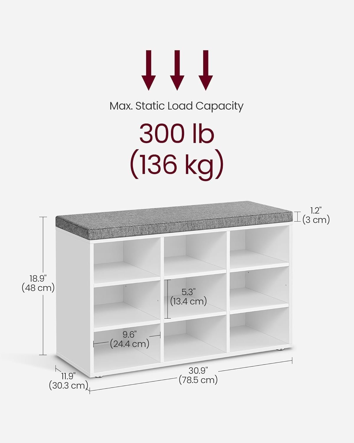 Specification: VASAGLE Pantofar cu banca cu 9 compartimente si perna, sarcina 136 kg, 79x30x48 cm, alb