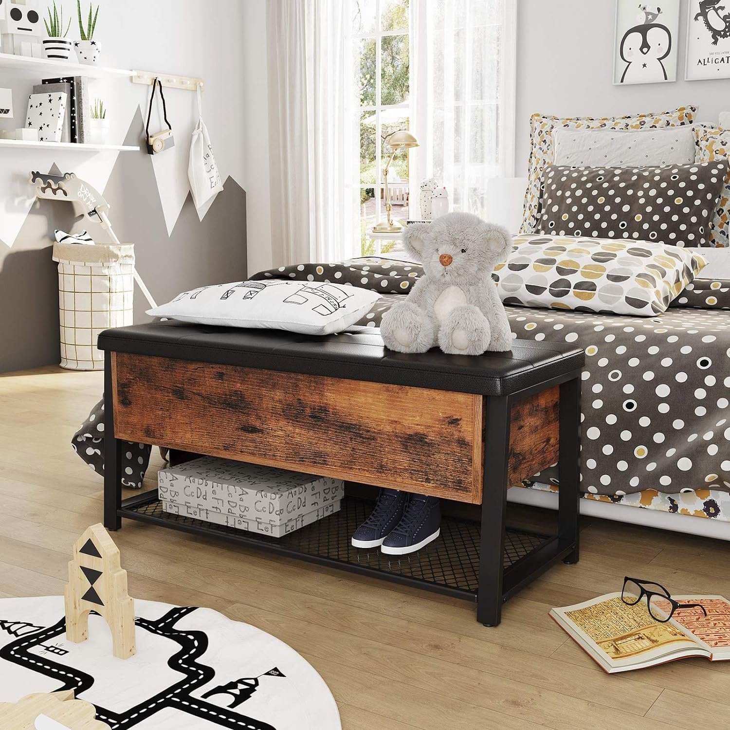 VASAGLE Pantofar de lemn cu spatiu de depozitare tip banca, cu sezut captusit si polita depozitare, stil industrial, 100x40x47cm, maro rustic si negru