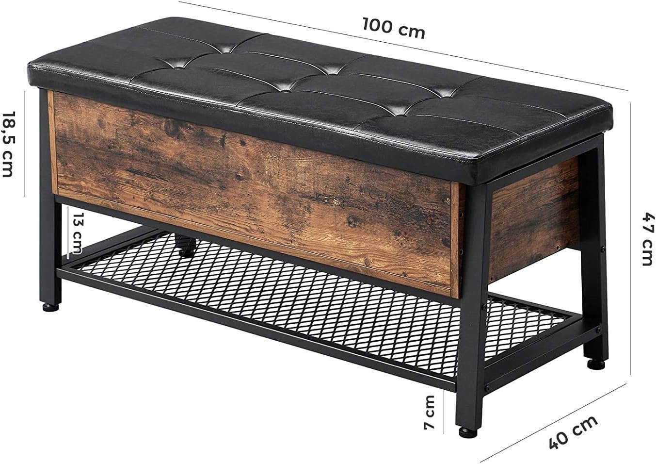 Specification: VASAGLE Pantofar de lemn cu spatiu de depozitare tip banca, cu sezut captusit si polita depozitare, stil industrial, 100x40x47cm, maro rustic si negru