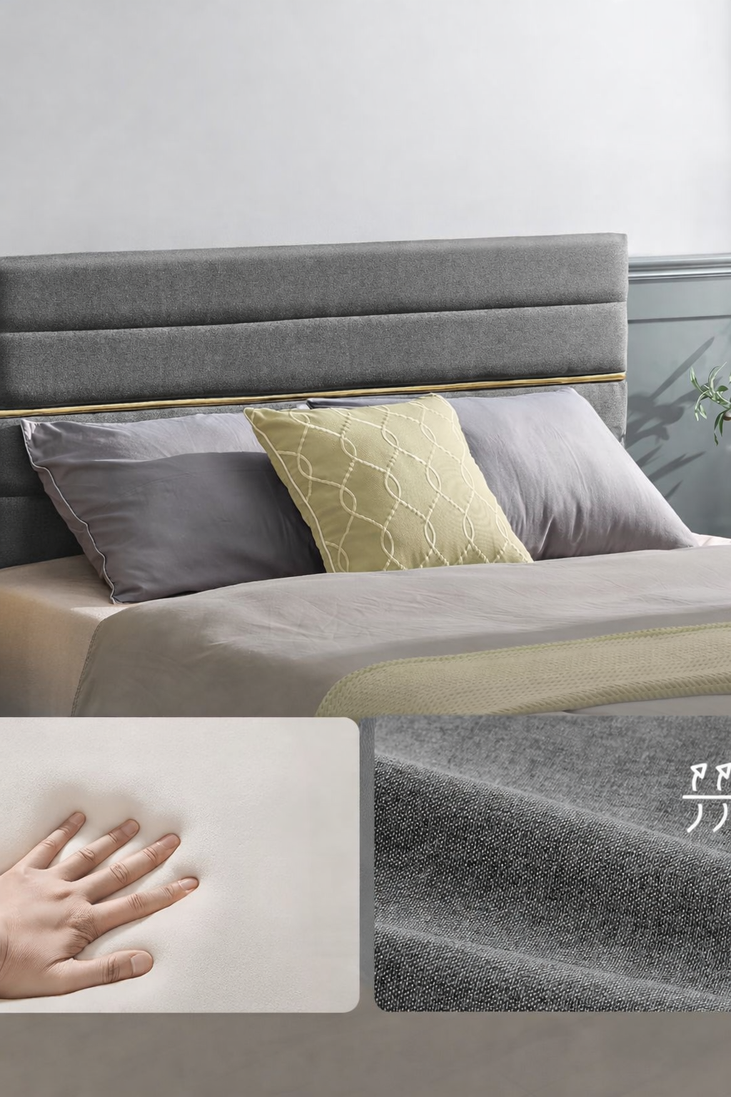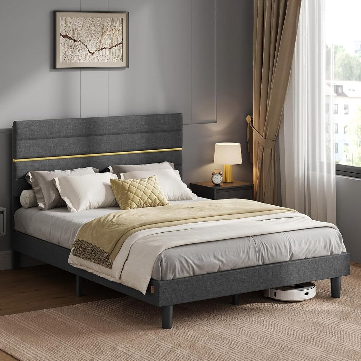 Specification: VASAGLE Pat tapitat 140×200 cm, cu tablie capitonata, somiera din lemn masiv reglabila, structura metalica, gri inchis