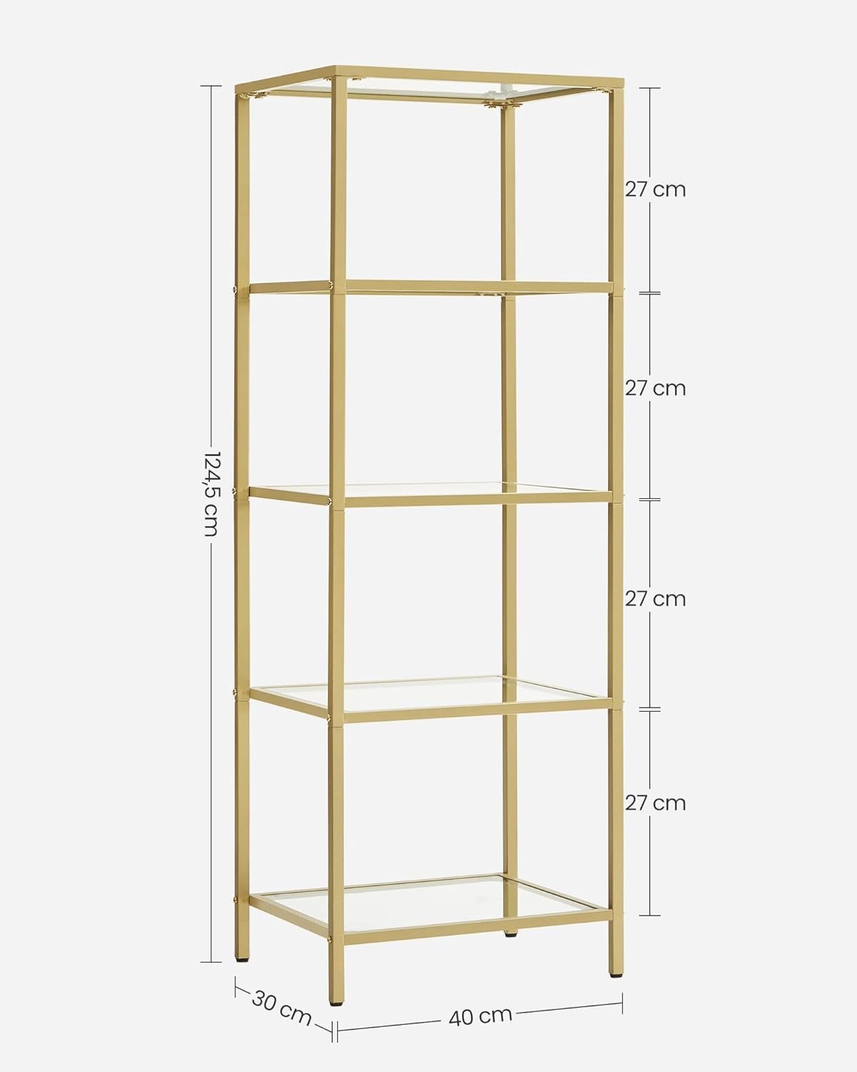 Specification: VASAGLE Raft cu trepte pentru dormitor, 5 etaje, din sticla securizata, cadru din otel, 30x124x40cm, auriu