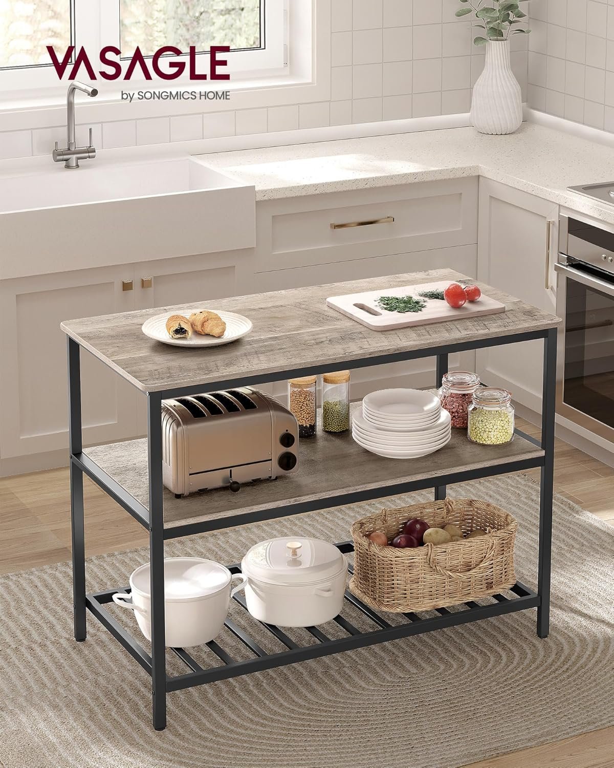 VASAGLE Raft de bucatarie tip insula, cadru de otel cu 3 nivele, stil industrial, 60x120x90cm, gri stejar