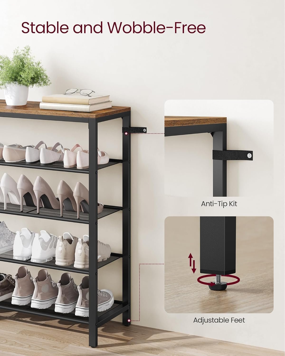VASAGLE Raft de pantofi, cu 4 rafturi din plasa, cadru din otel, industrial, 30x100x92cm, maro rustic si negru