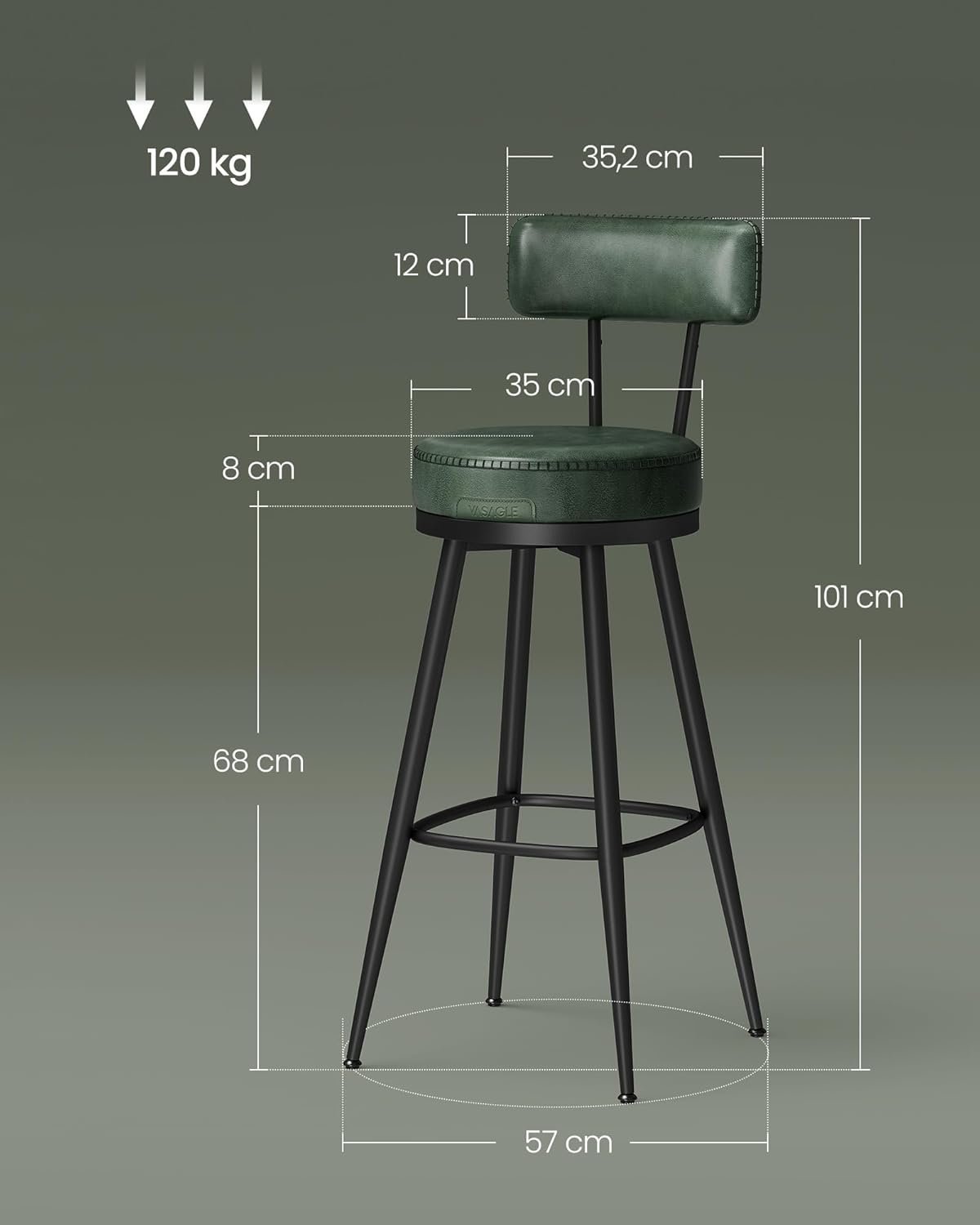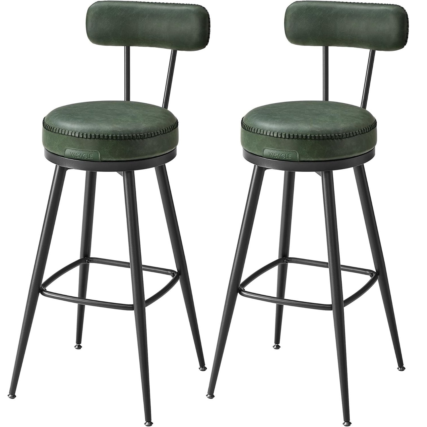Specification: VASAGLE set 2 scaune de bar rotative 360°, cu spatar, inaltime 101 cm, piele sintetica, cadru otel, stil modern, verde