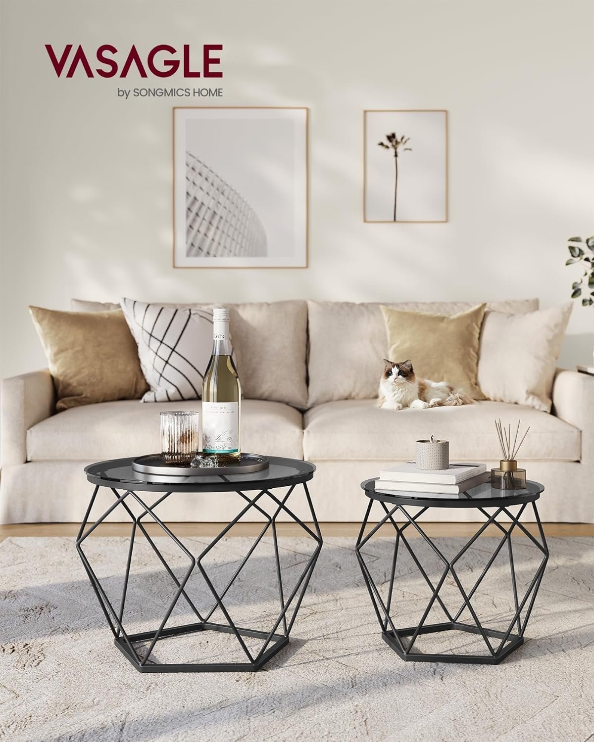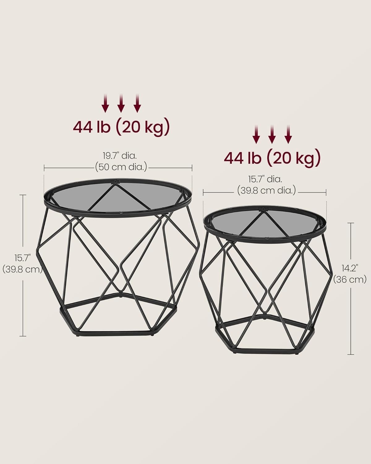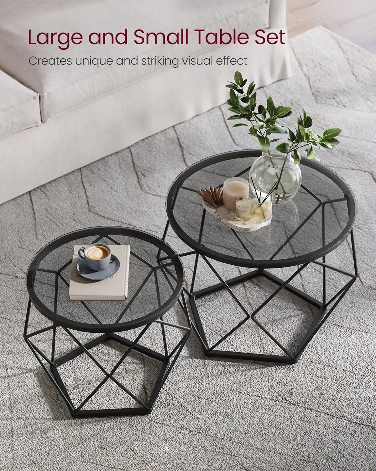 Specification: VASAGLE Set de 2 mese de cafea rotunde, cadru otel si blat detasabil din sticla, 40cm si 50cm, negru