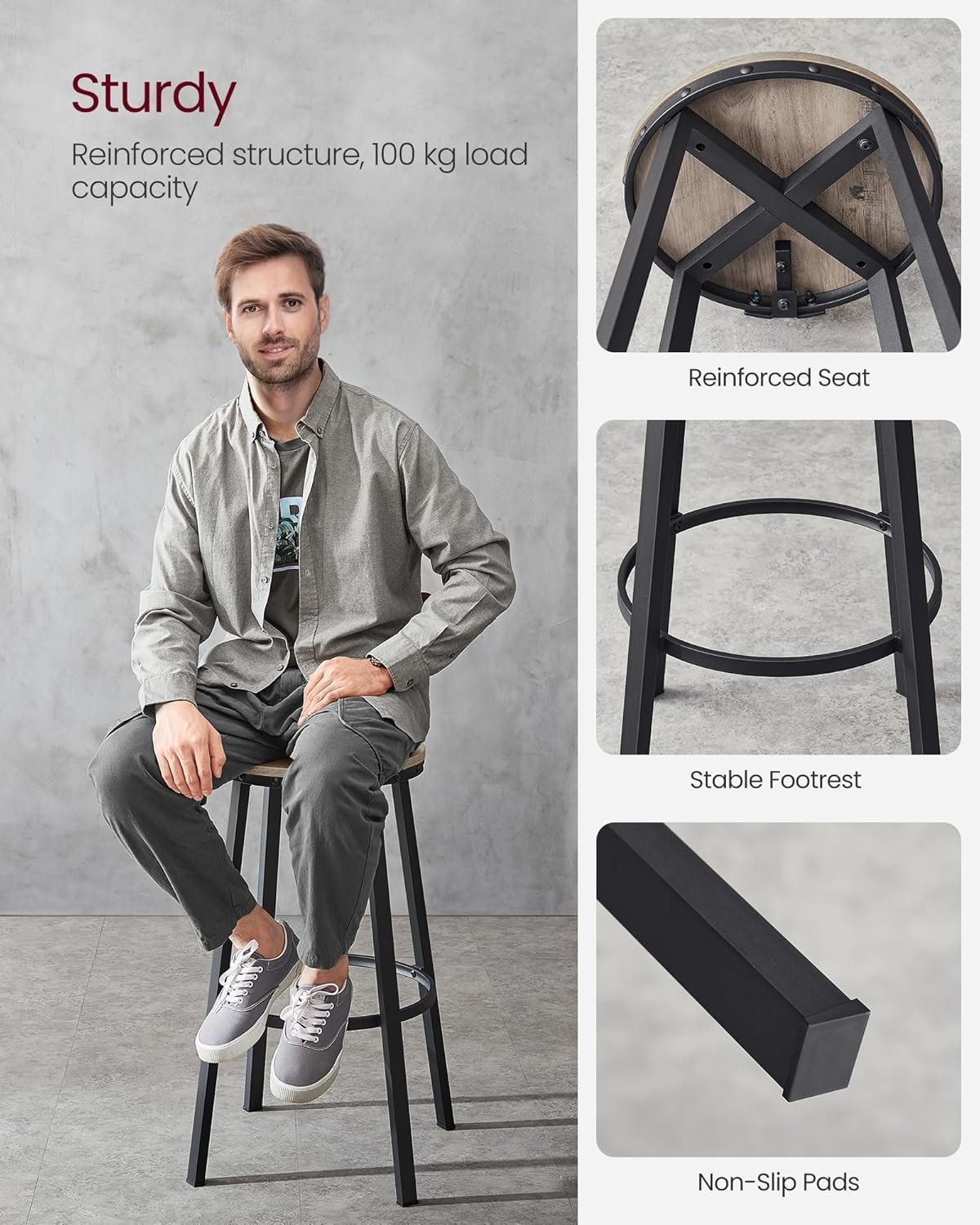 Specification: VASAGLE Set de 2 scaune de bar inalte cu spatar, cadru din otel, industrial, 54x99cm, gri stejar